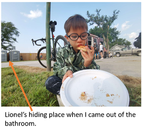 The first town, St. Charles, had a “Beep, beep” theme. My plan was to speed through like the Road Runner, but Lionel had other ideas. At 7:30 a.m., he opted for a slice of pepperoni pizza, as is typical on RAGBRAI. The port-a-potties in St. Charles had a tricky locking mechanism, and I had a moment of panic when I thought Lionel may lock himself in. My fears were doubled moments later when I couldn't find him after leaving the port-a-potty. He jumped out from behind two of them, shouting “Boo!” and asking if he scared me. We had one of our many mini life-lessons right then and there.