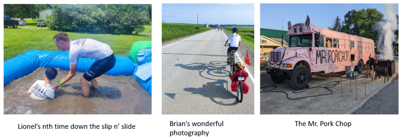 On the final stretch of the day, Brian and I decided to stop at Mr. Pork Chop. Mr. Pork Chop, one of RAGBRAI's original vendors, had passed away earlier this year, but his legacy continued with his son serving up giant pork chops from a piggy mobile. As we ate, we could faintly see the orange water tower in the distance.